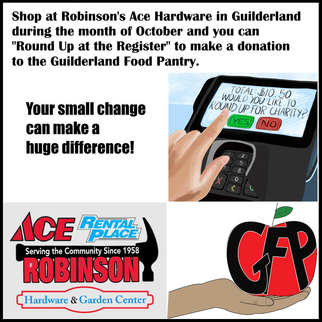 During the month of October, Robinson's Ace Hardware in Guilderland (Western Ave) is holding a "Round Up at the Register" to benefit the Guilderland Food Pantry.