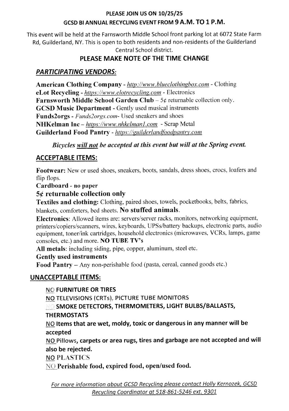 The Guilderland Food Pantry will be participating in the Guilderland Central School District's Bi-Annual Recycling Event on Saturday, October 25 from 9am - 1pm. This event will be held at the Farnsworth Middle School front parking lot at 6072 State Farm Rd. This is open to both residents and non-residents of the Guilderland Central School district.