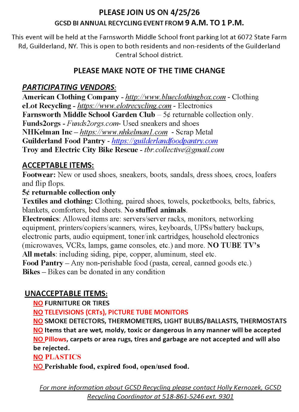 GCSD Bi-Annual Recycling Event - Saturday, April 25, 2026Please join us on April 25 for the Guilderland Central School District's Bi-Annual Recycling event from 9am - 1pm.Representatives of the Guilderland Food Pantry will have a table set up to accept food and monetary donations.