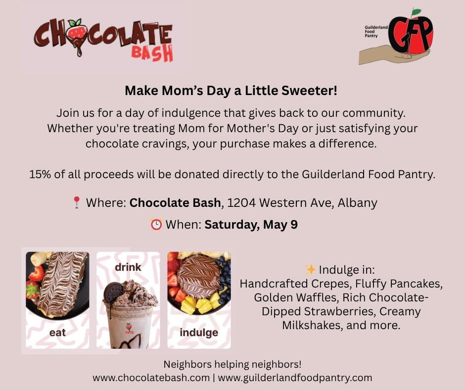 Chocolate Bash, 1204 Western Ave, Albany - Saturday, May 9, 2026Join us for a day of indulgence that gives back to our community. Whether you're treating Mom for Mother's Day or just satisfying your chocolate cravings, your purchase makes a difference.15% of all proceeds will be donated directly to the Guilderland Food Pantry.